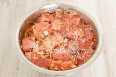 Свининка, лук, специи и уксус тщательно перемешиваются и маринуются вне холодильника не менее 3 часов.