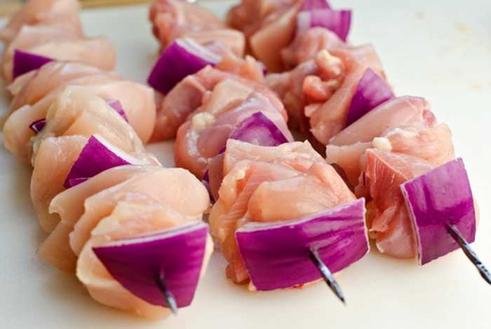 - Нанизать мягкие ломтики курятины на шпажки, поочередно с луком. Для вкуса можно накалывать вместе с курятиной кусочки ананаса, перец, шляпки сырых грибов.