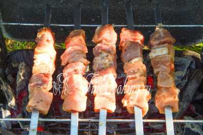 Шашлык на таком маринаде готовится быстрее потому, что при нагревании масло вытапливается и прогревает мясо изнутри, одновременно с этим не позволяя шашлыку пересушиться. По этой же причине следует внимательно следить, чтобы капающее на угли масло не позволяло разгораться пламени.