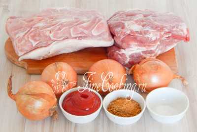 Для приготовления вкусного, сочного и ароматного шашлыка нам понадобятся следующие ингредиенты: мякоть свинины (у меня шея и корейка с небольшим количеством жира), репчатый лук, кетчуп, приправа для шашлыка и немного соли (если приправа содержит ее малое количество или вы любите соленое).