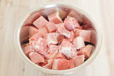 Свиная шея без кости нарезается крупными кусочками. Для удобства я слегка подморозила свежее мясо в морозилке.