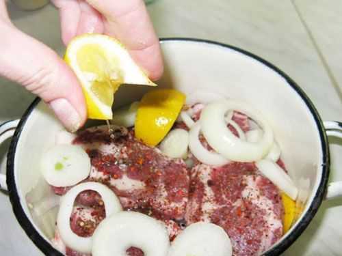 - Лимоны нарезаются, очищаются от косточек и смешиваются со смесью мяса и лукового сока. Идеальный вариант – отжать лимоны и использовать в маринаде только их сок.
