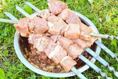 Достаем кусочки свинины из миски, стряхиваем лук (он больше не понадобится) и нанизываем каждый на шапмуры. Всего из указанного количества ингредиентов у меня получается 9 порций шашлыка (то есть 9 шампуров по 5-6 кусочков мяса на каждом).