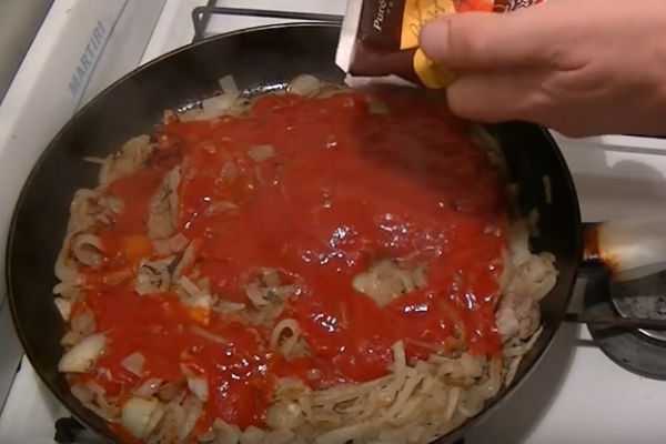 Берем сковороду и нагреваем ее на довольно сильном огне. Наливаем подсолнечное масло и проверяем степень нагрева, положив ломтик лука, если он шипит в жире, то можно высыпать в сковороду весь оставшийся после маринования лук. Пассируем маринованный лук до золотистой корочки, не забывая помешивать. Затем, не снимая с огня заливаем томатной пастой.