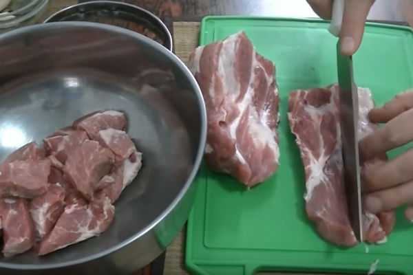 После того как все ингредиенты были подготовлены можно начинать приготовление шашлыка из свинины в рукаве в духовке. Свежее мясо свинины перед готовкой любых блюд желательно ополоснуть холодной водой, после чего обсушить с помощью салфеток или бумажного полотенца. Замороженное мясо в этом не нуждается, его достаточно просто разморозить. Нарежьте мясо такими кусочками, как для классического шашлыка. Выложите его в миску.