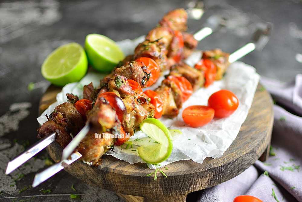 - Маринуйте шашлык 2 часа при комнатной температуре, после этого нанизывайте на шампуры или выкладывайте на решетку и жарьте до готовности. Приятного аппетита!