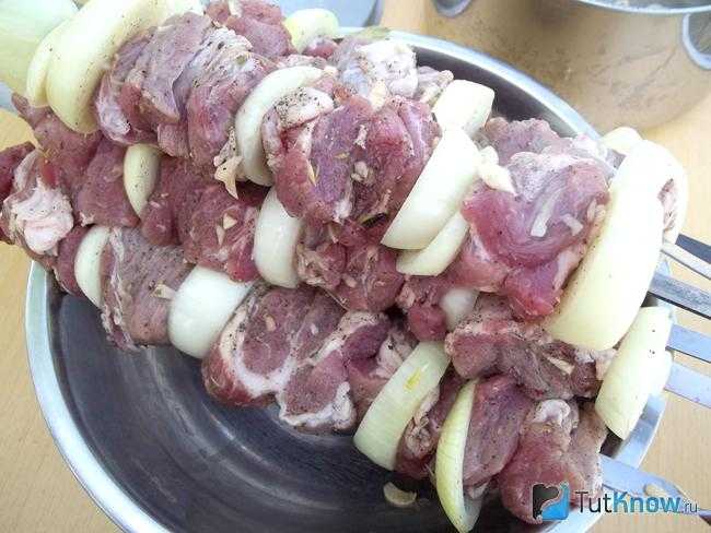 3. Оставьте мариноваться свинину на ночь, но лучше выдержате ее сутки. Спустя определенное время нанизайте ее на шампур поочередно чередуя с кружочками репчатого лука.