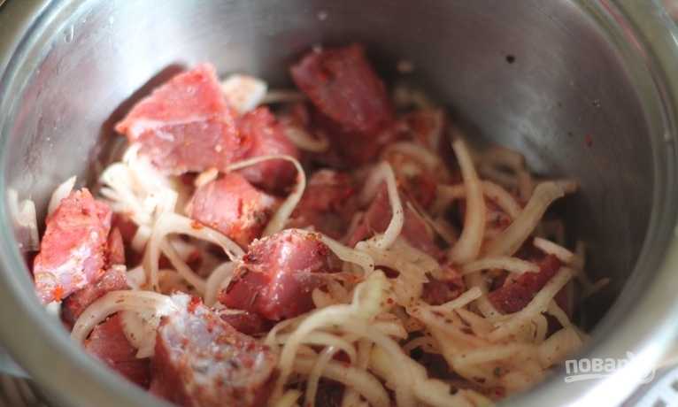 - Вымойте и высушите мясо, нарежьте его прямоугольниками примерно 4*3 см. Почистите лук и нарежьте его кольцами. Сложите в кастрюлю мясо с луком и перемешайте.