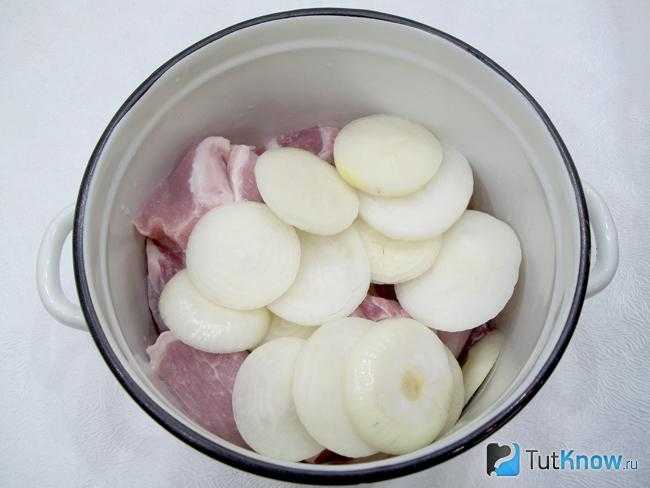 2. Репчатый лук очистите от шелухи, помойте, нарежьте кольцами толщиной по 1 см и отправьте в кастрюлю к мясу. Не смотря на то, что лук для многих не пригоден для еды, но его должно быть очень много. Он пустит свой сок, который поможет лучше промариноваться кусочкам мяса.