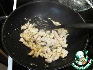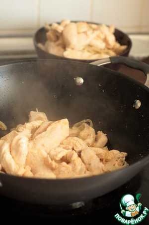 Здесь надо сказать, что вок я только начала осваивать и вот на что обратила внимание — лучше готовить маленькими партиями мясо, тогда оно готовится более равномерно. Поэтому я готовила небольшими частями, перекладывая готовую курицу в пиалу