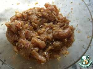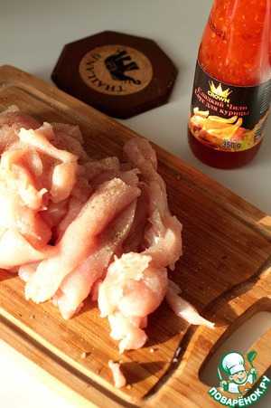 Готовится это блюдо очень просто. Куриную грудку нужно нарезать на тонкие ломтики, посолить, поперчить и оставить на пару минут.