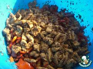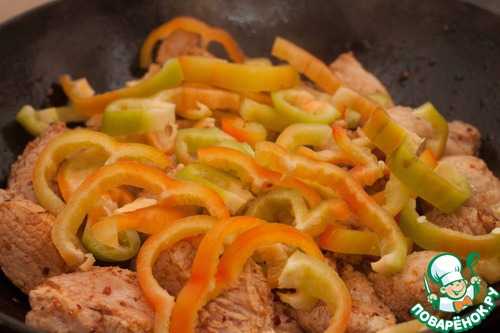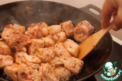 Нарезав перец, отправляем пропитавшееся специями мясо в горячее масло и в течении минуты перемешиваем для равномерного прожаривания.