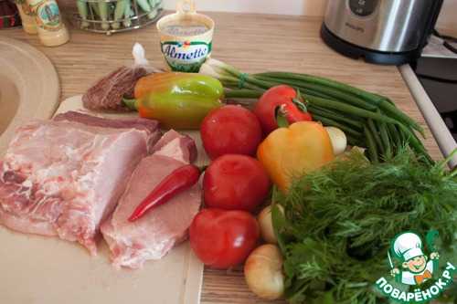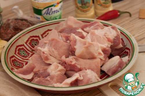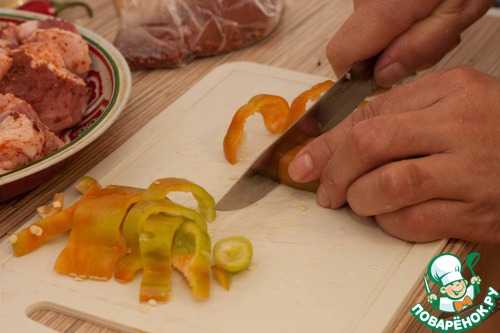 - 6) К чесноку и перцу выкладываем обжаренное мясо, добавляем молотую паприку, сычуаньский перец, зиру и соль. Перемешиваем содержимое вока и жарим шашлык, помешивая, в течение 2-3 минут.