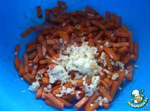 Затем накалить вок и обжарить морковь+соль, перец, немного соевого соуса. Выложить в чашку (большую); выдавить чеснок, посыпать сухими приправами.