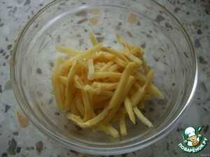 режем перец соломкой, почему перец, потому что он самый твердый из овощей, вот он и идет первым)))