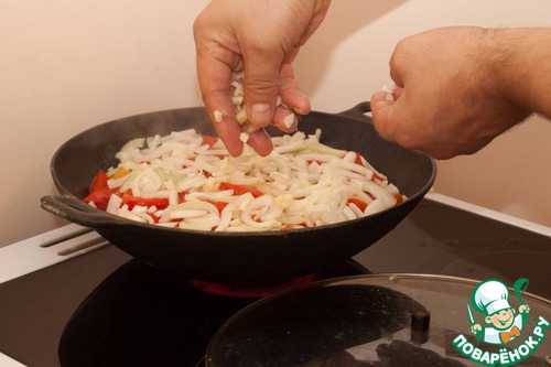 Лук, чеснок, солим и перчим, кладем стручок кайенского перца и снова крышкой на 5 минут.