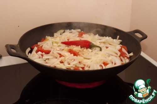 Пока курица маринуется, мы нарезаем лук, чеснок и немного чили. Выкладываем в горячую сковородку вок и обжариваем пару минут, пока лук не поменяет цвет на нежно-розовый.