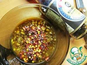 Имбирь натереть на мелкой терке. Чеснок либо мелко нарезать, либо раздавить прессом. Смешать вместе имбирь, чеснок, перец чили, воду, соевый соус Kikkoman, уксус. Отставить в сторонку.