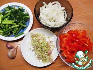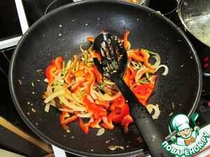 Отдельно обжарить лук, болгарский перец и стрелки чеснока в течение 2-3-х минут на большом огне.