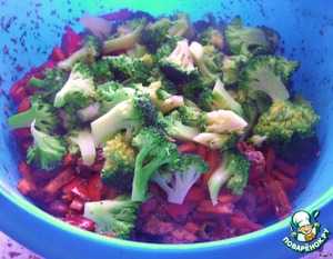 Подготовить остальные овощи: морковь, перец нарезать брусочками, обрезать соцветия у брокколи, очистить чеснок и нарезать очень мелко острые перчики.