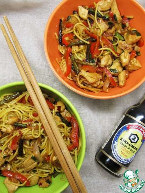 Обожаю лемонграсс, обожаю вок. С обоими этими товарищами я впервые познакомилась в своей первой длительной поездке по Китаю. Лемонграсс чаще добавляли в блюда в тайских ресторанчиках, а вок, конечно, в лапшичных. Но были моменты, когда встречались оба моих любимца, и этот рецепт как раз один из таких. Легкая пряная кислинка лемонграсса с курицей, слегка обжаренные стрелки чеснока с перцем, острый яркий соус, вкусная лапша… ммм… это просто объедение!