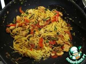 Обжарить в небольшом количестве масла лемонграсс на большом огне, не больше минуты. Затем добавить к нему курицу. Обжаривать до легкого румянца. Затем убрать в сторону. Параллельно сварить лапшу до аль-денте и отбросить её на дуршлаг.