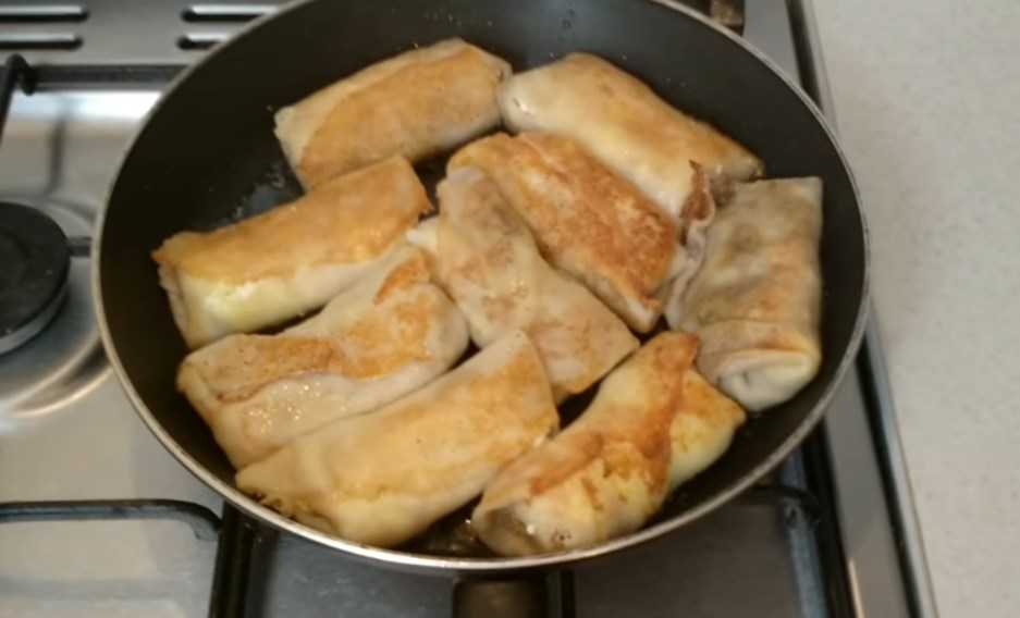 Чтобы яйцо приготовилось, мы фаршированные конвертики немного поджарим.