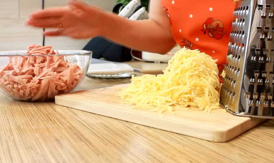 Вкуснее, когда ветчинные кусочки и сыр мелко нарезаны или натерты. Правда, натереть мясо не очень легко, поэтому нарежьте его тонкой соломкой.