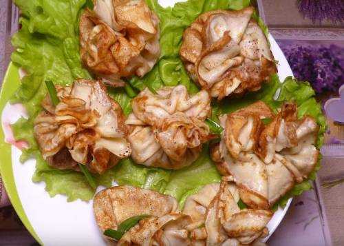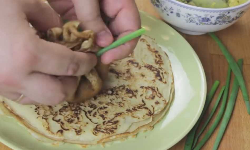 - Упакуйте начиночку внутрь каждого блинчика, оформите как надо и подавайте на стол, покрыв сверху кольцами зеленого лука.