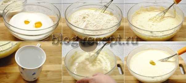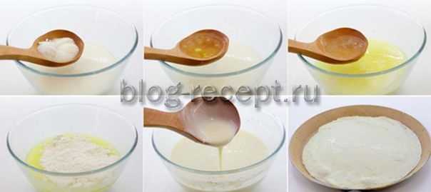 - Куриные яйца соединить с сахаром, влить молоко комнатной температуры и ещё раз взбить миксером. Засыпать муку, просеянную через сито, прибавить соду и соль. Энергично помешивать, пока не разобьются комочки. Поставить в место, без отсутствия сквозняков, тесто должно «дойти», по времени не более получаса.