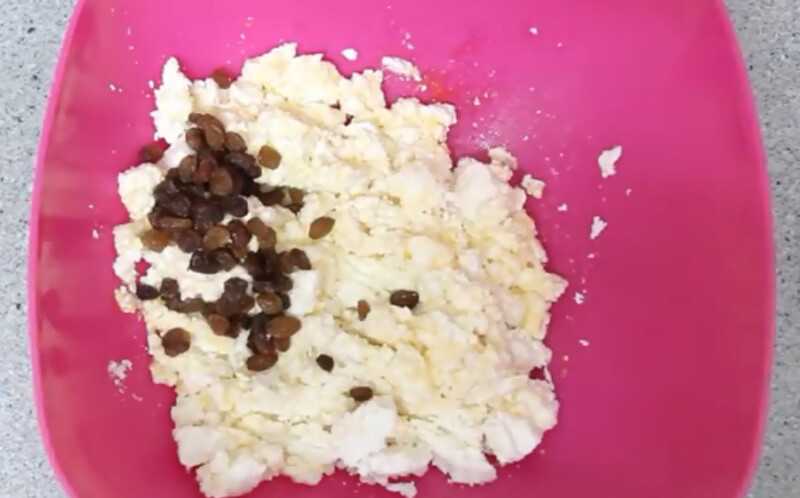Залей 50 г изюма кипятком. Смешай 500 г творога с 1 желтком и 2 ст. л. сахара. Можно добавить немного ванили, если любишь ее неповторимый вкус и аромат. -