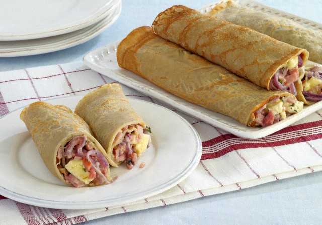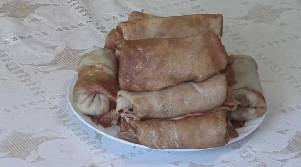 Начнем с теста. Чтобы все у нас хорошо свернулось, на сгибах не образовалось трещин, конвертик был аккуратным, нам потребуются тонкие блины. Вы, без сомнения, можете приготовить их по своему любимому рецепту, а я предложу два на выбор.