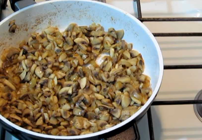 — Грибы промываем, режем не слишком мелко, обжариваем на сковороде, пока они не станут мягкими. Отставляем в сторону, выложив на тарелку, даем остыть.