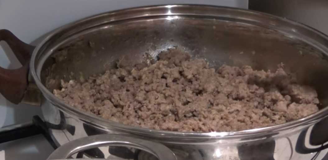 Разогреваем сковороду и начинаем обжаривать фарш до готовности.