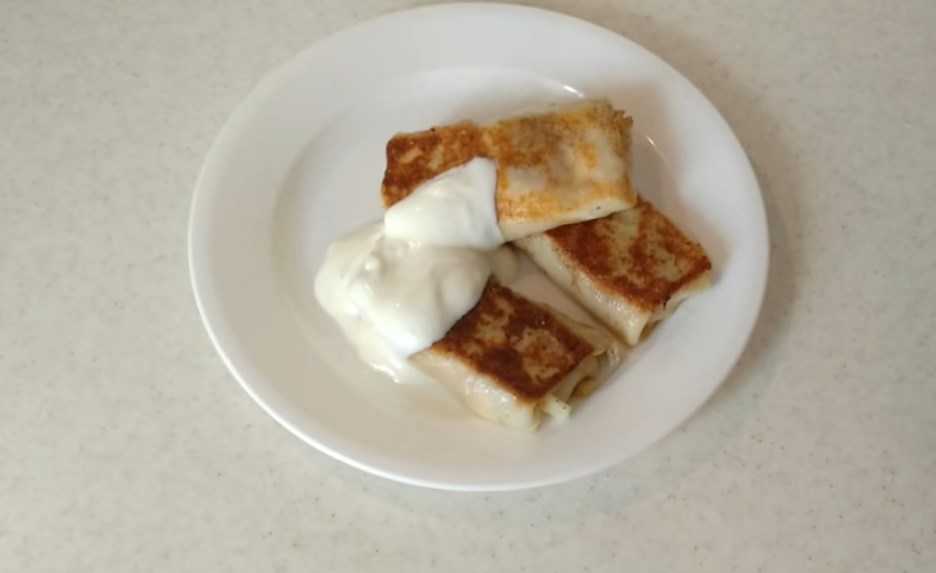 Можно сделать другую начинку, если вы не хотите увеличивать жирность продукта. Также блины с этим наполнением отлично сохраняются после разморозки в микроволновке.