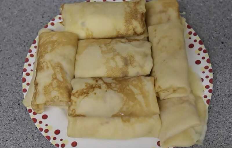 Теперь заворачиваем в трубочку. Когда все блины завернуты, убираем их в холодное место на пару часов.