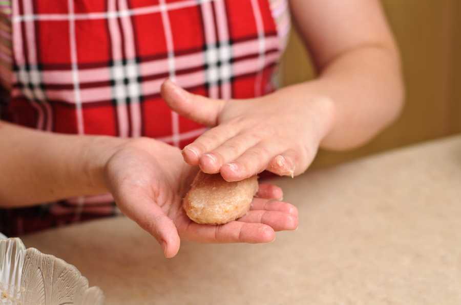 После такой процедуры отправляем фарш в холодильник на 2 часа. После настаивания, формируем мясные комочки в котлетки, примерно одного веса и формы. Обваливаем в муке.