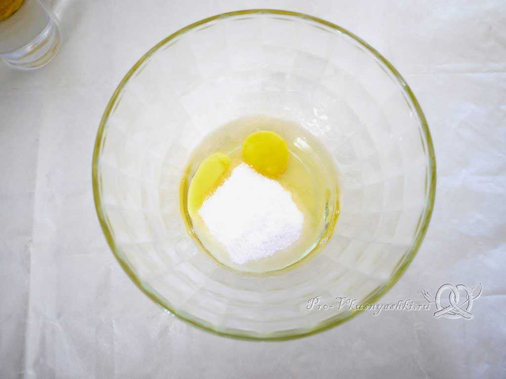 В подходящую посуду разбиваем пару куриных яиц, добавляем 2 столовые ложки сахара и щепотку соли.