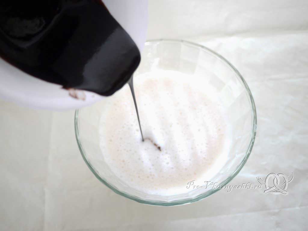 Теперь добавляем к тесту крутой кипяток (1 ст): одной рукой тонкой струйкой вливаем жидкость, одновременно с этим другой рукой перемешиваем массу венчиком.
