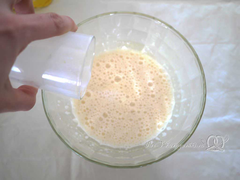 - Разбейте в миску яйца и добавьте к ним обычный, ванильный сахар и соль.