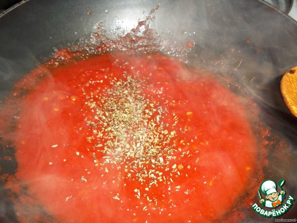 Делаем соус и в тоже время включаем духовку на 200 градусов, чтобы нагрелась. Я вместо 4 помидоров взяла 3 и 3 ст.л. томатной пасты, она придает соусу насыщенный красный цвет и вкуснее, мне так кажется. Помидоры измельчить в кашицу. Разогреваем масло и кладем туда чеснок, когда отдаст аромат, выбрасываем. У меня есть ароматизированное масло с чесноком и красным жгучим перчиком, я использовала его. Кому интересно, даю рецепт, все очень просто: добавляем к маслу мелко нарезанный чеснок и острый перец и ставим в прохладное темное место на 2-3 дня, потом можно использовать, как обычное масло. Тушим соус минутки 3-4 и снимаем с огня. Добавляем орегано щедро! Перемешиваем.