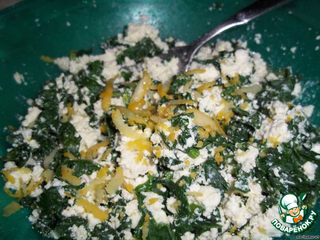 Собираем начинку: добавляем к творогу сыр (у меня соленый, поэтому солить начинку не пришлось), шпинат, цедру одного лимона и перец красный (который нужно измельчить). Я уже добавила измельченный (хлопьями, не порошок) перец, слегка острый и все перемешать. Готово.