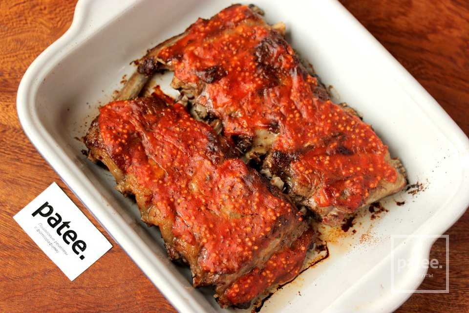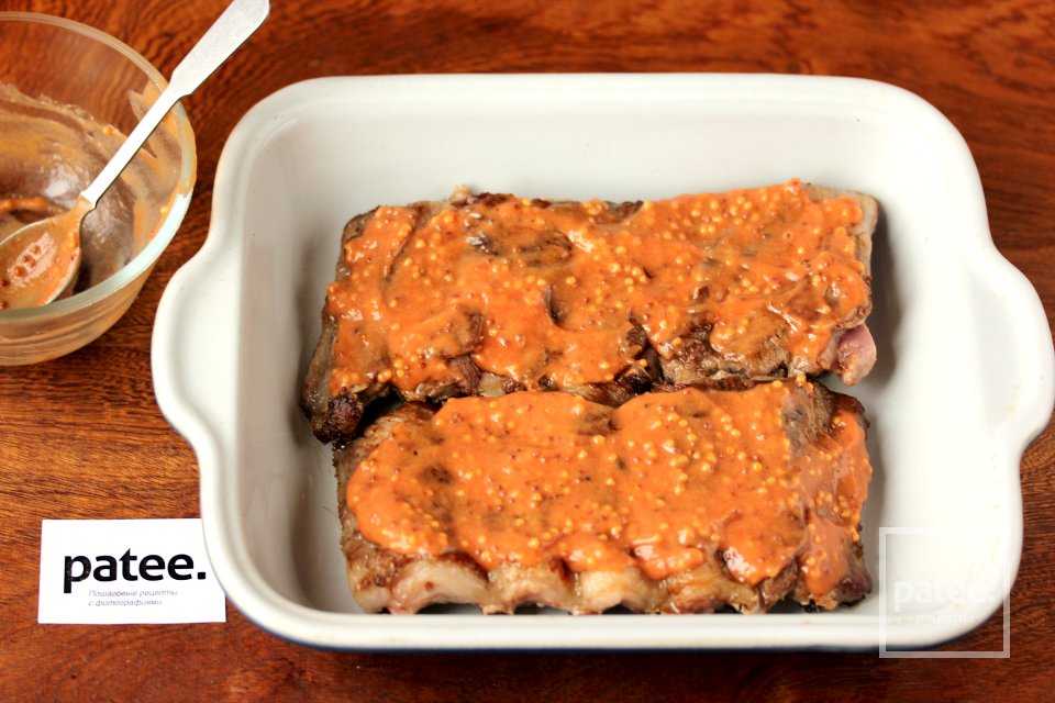 Покрываем обжаренные свиные рёбра горчично-томатным соусом.