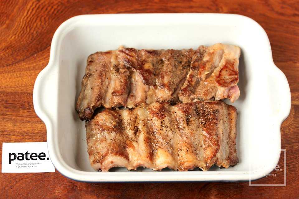 Перекладываем обжаренные свиные рёбра в форму для запекания.