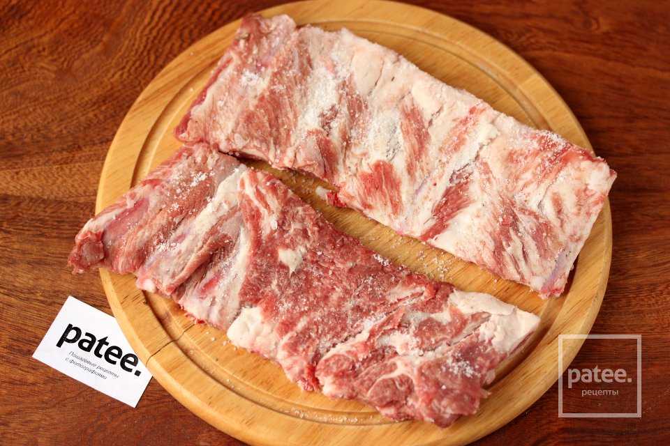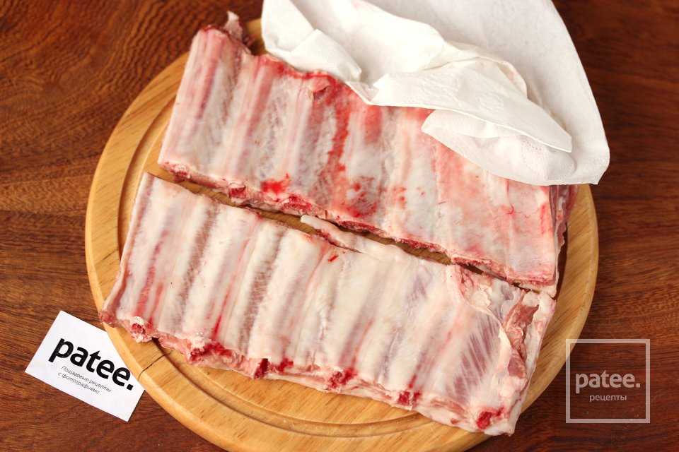 Обычно правильно нарезанные куски свинины с ребром весом не более 250 грамм. И длина реберной косточки 8-10 см. Толщина нарезанного мяса чуть больше толщины косточки. Не стоит использовать «парную» свинину, там ее приготовлении много тонкостей. Лучше использовать мясо, которое хотя бы 1-2 суток полежало в холоде. Ну и, это личное, я бы не использовал размороженное мясо, хотя сейчас сложно сказать какое продают мясо. Куски свинины на ребре надо вымыть и обсушить салфеткой.