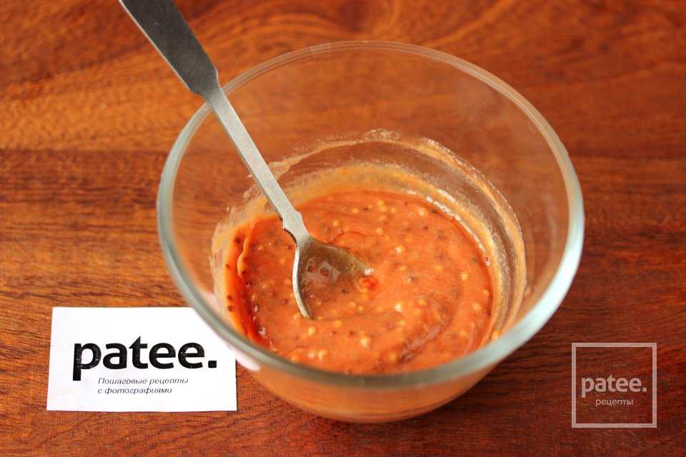 Пусть свиные рёбра полежат в стороне, а мы пока приготовим соус-намазку для них. Итак, в миску перекладываем зернистую горчицу.