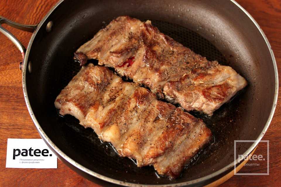 Свиные ребра быстро обжариваем на подсолнечном рафинированном масле с двух сторон на сильном огне. Наша цель- получение корочки, а не доведение рёбер до готовности!