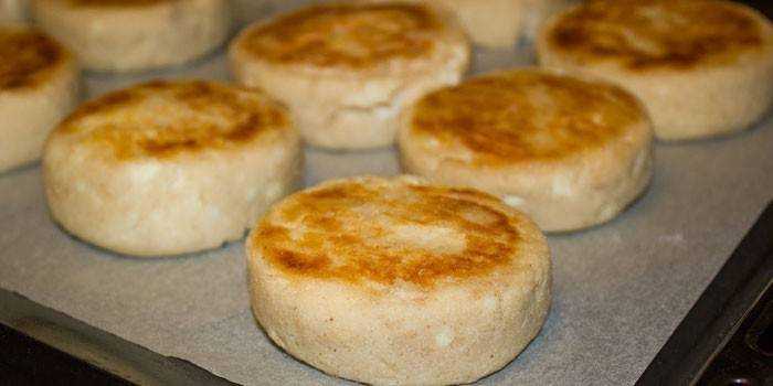 - Руками из теста формируют небольшие лепешки, их кладут на смазанный маслом противень.