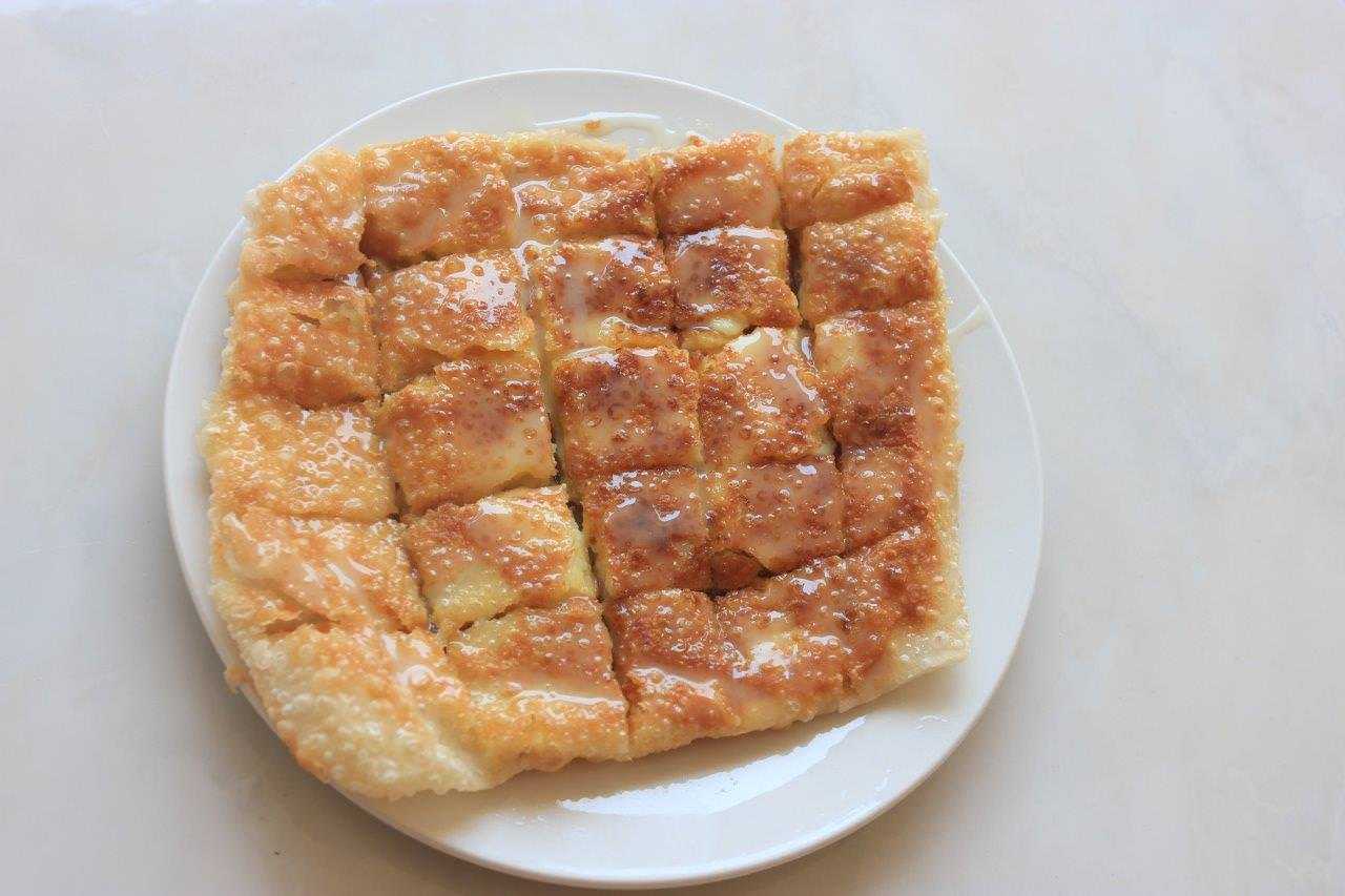 6) Готовый блин выложите на салфетку или бумажное полотенце. Разрежьте его на 9 равных частей и сверху полейте сгущенкой и растопленным шоколадом (нутелой). Употреблять тайские блинчики следует теплыми. Приятного аппетита!