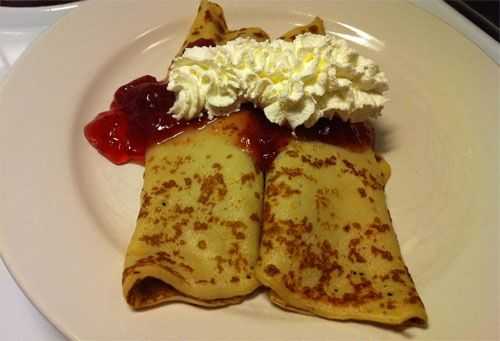 Если вы не будете использовать для блинов молоко и яйцо, они получатся достаточно тонкими и немного пресными. Поэтому рекомендуем подавать такие изделия с начинками и соусами, имеющими ярко выраженный вкус и аромат. Клубничный соус – идеальный вариант.